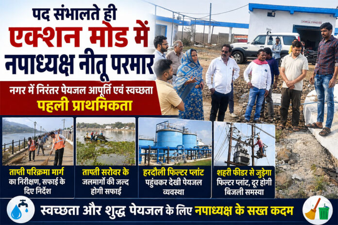 मुलताई। नगरपालिका अध्यक्ष का पद संभालते ही नीतू परमार पूरी तरह एक्शन मोड में नजर आ रही हैं। शहर में बेहतर पेयजल व्यवस्था और साफ-सफाई सुनिश्चित करने के उद्देश्य से उन्होंने जमीनी स्तर पर तेजी से काम शुरू कर दिया है। इसी कड़ी में मंगलवार सुबह करीब 6 बजे नपाध्यक्ष ने नगर के विभिन्न क्षेत्रों का निरीक्षण कर व्यवस्थाओं का जायजा लिया और अधिकारियों-कर्मचारियों को आवश्यक निर्देश दिए।