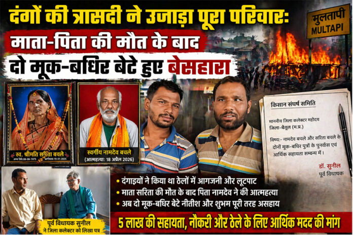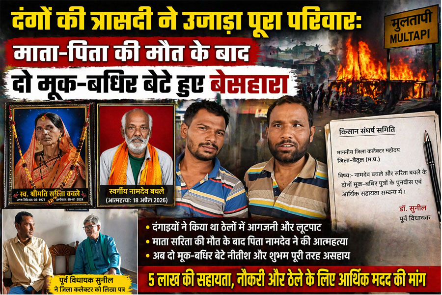 मुलताई। पवित्र नगरी में हुई आगजनी और दंगों की एक दर्दनाक कहानी सामने आई है, जिसने एक पूरे परिवार को तबाह कर दिया। माता-पिता की मौत के बाद अब दो मूक-बधिर बेटे—नीतीश बचले और शुभम बचले—पूरी तरह से निराश्रित और असहाय हो गए हैं। इस हृदयविदारक घटना को लेकर पूर्व विधायक एवं किसान संघर्ष समिति के राष्ट्रीय अध्यक्ष डॉ. सुनीलम ने जिला कलेक्टर बैतूल को पत्र लिखकर तत्काल सहायता और पुनर्वास की मांग की है।