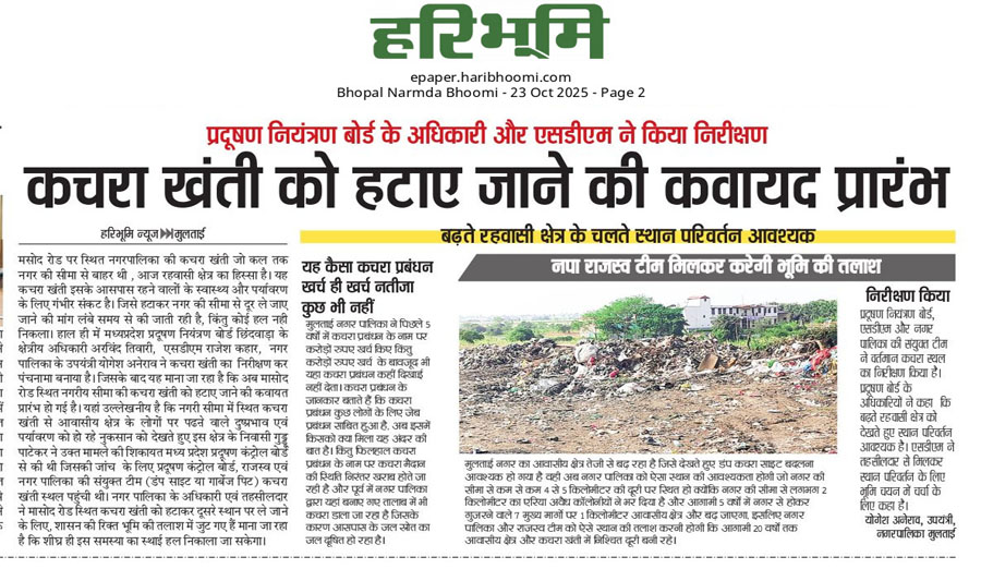 उल्लेखनीय है कि हाल ही में प्रदूषण नियंत्रण बोर्ड और एसडीएम ने मुलताई कचरा खंती का निरीक्षण कर पंचनामा तैयार किया था। इस संबंध में हरिभूमि द्वारा प्राथमिकता से समाचार प्रकाशित कर अनियमितताओं की ओर ध्यान आकृष्ट कराया गया था। इस प्रकाशन के बाद प्रदूषण नियंत्रण बोर्ड ने कड़ा रुख अपनाते हुए कचरा प्रबंधन में की जा रही अनियमितताओं पर सख्त कार्रवाई शुरू की है। माना जा रहा है कि कचरा प्रबंधन पर खर्च किए गए करोड़ों रुपये की भी जांच कराई जा सकती है।