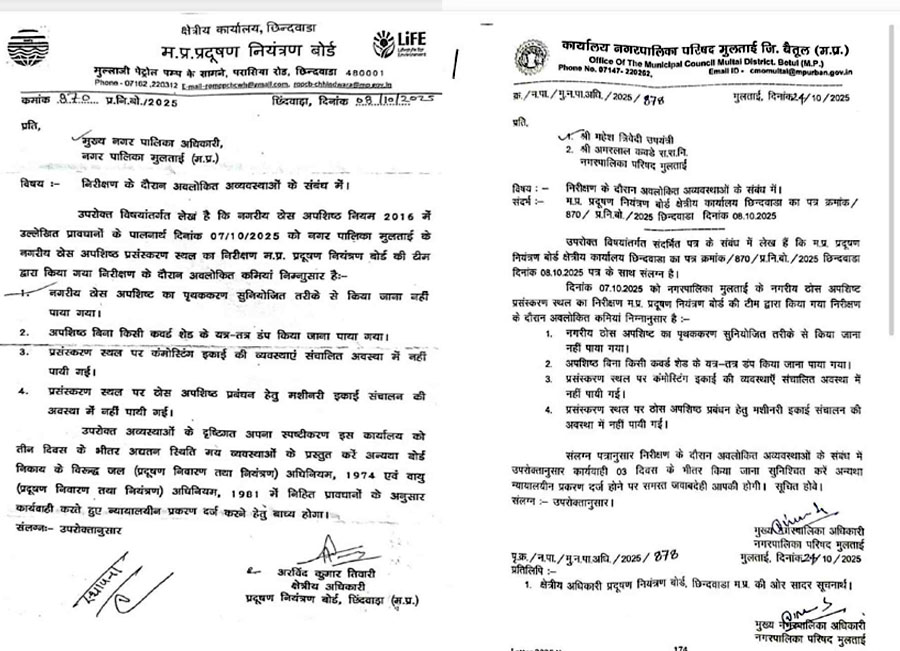 मुलताई। मासोद रोड स्थित नगर पालिका की कचरा खंती में कचरा प्रबंधन के नाम पर करोड़ों रुपये खर्च किए जाने के बावजूद गंभीर अनियमितताएँ पाई गई हैं। मध्य प्रदेश प्रदूषण नियंत्रण बोर्ड, छिंदवाड़ा के क्षेत्रीय अधिकारी अरविंद कुमार तिवारी ने मुलताई कचरा खंती का निरीक्षण कर स्थिति को अत्यंत खराब पाया है। इस पर नगर पालिका को कारण बताओ नोटिस जारी किया गया है। नोटिस में तीन दिनों के भीतर स्पष्टीकरण देने के निर्देश दिए गए हैं, अन्यथा बोर्ड द्वारा जल प्रदूषण निवारण एवं नियंत्रण अधिनियम 1974 तथा वायु प्रदूषण निवारण एवं नियंत्रण अधिनियम 1981 के प्रावधानों के तहत न्यायालय में प्रकरण दायर करने की चेतावनी दी गई है।